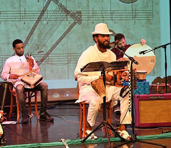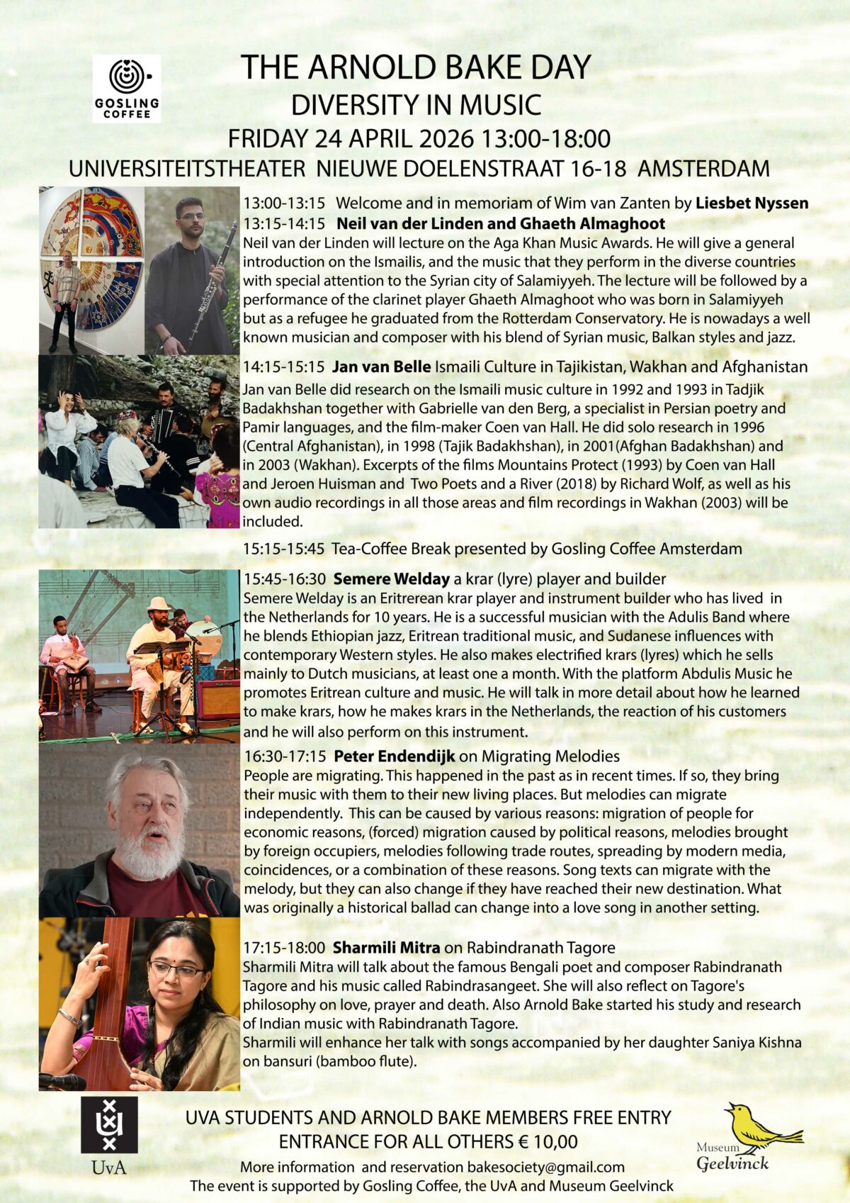 Bake Day ‘Diversity in Music’, 24 April Universiteitstheater Amsterdam, 13h – 18h Gepubliceerd op: 8 april 2026 De Arnold Bake Dag voor Etnomusicologen en iedereen die geinteresseerd is in traditionele muziek en dans van culturen over de hele wereld, vindt plaats op vrijdag 24 april. Aan de orde komen de Aga Khan Music Awards en muziek van de Ismailis in Syrie,Tadjikistan en Afghanistan; de lier in de muziek van Eritrea, migrerende melodieën op de Balkan en de muziek en gedichten van Rabindranath Tagore. Arnold Bake Day Friday 24 April 2026, 13:00-18:00h Address: Universiteitstheater, Nieuwe Doelenstraat 16-18, Amsterdam DIVERSITY IN MUSIC 12:00-13:00 Lunch in the foyer for members and participants13:00-13:05 Words of welcome13:05-13:15 In memoriam Wim van Zanten, by Liesbet Nyssen13:15-14:15 Neil van der Linden and Odai Alhayek14:15-15:15 Jan van Belle15:15-15:45 Tea break. Coffee and tea provided by Gosling Coffee15:45-16:30 Semere Welday16:30-17:15 Peter Endendijk17:15-18:00 Sharmili Mitra and Saniya Kishna Entrance : Free for Arnold Bake Society members and UvA studentsfor all others €10,- Programma 13:00-13:15 Welcome and in memoriam of Wim van Zanten by Liesbet Nyssen 13:15-14:15 Neil van der Linden and Odai Alhayek.Neil van der Linden will lecture on the Aga Khan Music Awards. He will give a general introduction on the Ismailis, and the music that they perform in the diverse countries with special attention to the Syrian city of Salamiyyeh. The lecture will be followed by a performance of percussionist and singer Odai Alhayek who is from Salamiyyeh. He made a name in the Netherlands as a music educator, performer and actor. As a musician he blends traditional sounds and contemporary influences. 14:15-15:15 Jan van Belle Ismaili Culture in Tajikistan, Wakhan and Afghanistan. Jan van Belle did research on the Ismaili music culture in 1992 – 1993 in Tadjik Badakhshan together with Gabrielle van den Berg, a specialist in Persian poetry and Pamir languages, and the film maker Coen van Hall. He did solo research in 1996 (Central Afghanistan), in 1998 (Tajik Badakhshan), in 2001 (Afghan Badakhshan) and in 2003 (Wakhan). Excerpts of the films Mountains Protect (1993) by Coen van Hall and Jeroen Huisman and ‘Two Poets and a River’ (2018) by Richard Wolf, as well as his own audio recordings in all those areas and film recordings in Wakhan (2003) will be included. 15:15-15:45 Tea-Coffee Break presented by Gosling Coffee Amsterdam 15:45-16:30 Semere Welday is an Eritrean krar player and instrument builder who has lived in the Netherlands for 10 years. He is a successful musician with the Adulis Band where he blends Ethiopian jazz, Eritrean traditional music, and Sudanese influences with contemporary Western styles. He also makes electrified krars (lyres) which he sells mainly to Dutch musicians, at least one a month. With the platform Abdulis Music he promotes Eritrean culture and music. He will talk in more detail about how he learned to make krars, how he makes krars in the Netherlands, the reaction of his customers and he will also perform on this instrument. 16:30-17:15 Peter Endendijk on Migrating Melodies.People are migrating. This happened in the past as in recent times. If so, they bring their music with them to their new living places. But melodies can migrate independently. This can be caused by various reasons: migration of people for economic reasons, (forced) migration caused by political reasons, melodies brought by foreign occupiers, melodies following trade routes, spreading by modern media, coincidences, or a combination of these reasons. Song texts can migrate with the melody, but they can also change if they have reached their new destination. What was originally a historical ballad can change into a love song in another setting. 17:15-18:00 Sharmili Mitra on Rabindranath Tagore.Sharmili Mitra will talk about the famous Bengali poet and composer Rabindranath Tagore and his music called Rabindrasangeet. She will also reflect on Tagore’s philosophy on love, prayer and death. Also Arnold Bake started his study and research of Indian music with Rabindranath Tagore. Sharmili will enhance her talk with songs accompanied by her daughter Saniya Kishna on bansuri (bamboo flute). Neil van der Linden & Odal Alhayek Semere Welday Peter Endendijk Jan van Belle (centre) in Tadjik Badakshan Sharmil Mitra De Arnold Bake Dag wordt georganiseerd door de Arnold Bake Society,in samenwerking met Gosling Coffee Amsterdam, de UvA en Museum Geelvinck