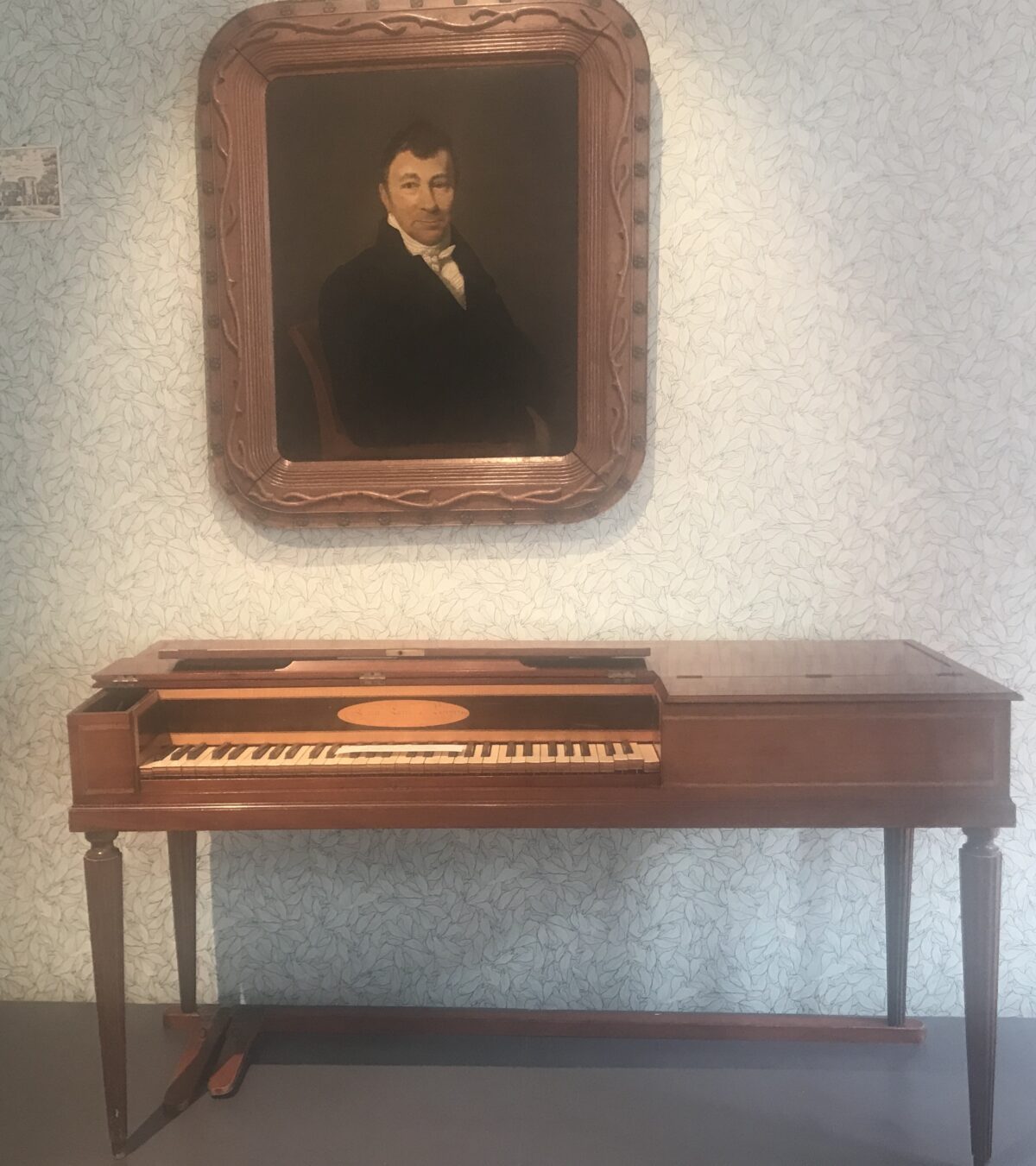 foto: portret van de dichter A.C.W. Staring en daaronder een Erard tafelpiano 1787 – 1788 (coll. Geelvinck)
