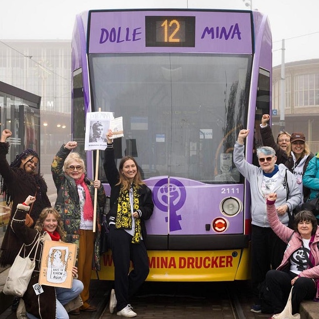 Tram 12: Hommage aan Wilhelmina Drucker, 5 december 1925 – 5 december 2025 Gepubliceerd op: 8 december 2025 De Wilhelmina Drucker tram De hele maand december kun je haar zien rondrijden: de speciale Wilhelmina Drucker tram. Het is een initiatief van de Wilhelmina Drucker Fundatie die zich al het hele jaar inzet om deze pionier van de vrouwenbeweging opnieuw te eren. Zo kregen het Schegpark in Amsterdam-Noord en een tuin in Amsterdam-Zuid onlangs nieuwe namen: het Wilhelmina Drucker Park en de Wilhelmina Drucker Tuin. Vandaag is het precies honderd jaar geleden dat Drucker overleed en daarom was dit de perfecte dag voor een Dolle Mina actie. Dolle Mina is namelijk vernoemd naar Drucker. Om 10.00 uur verzamelden we met een groepje mina’s bij het Amstelstation, met mandjes vol mandarijntjes en het Minafest. Tijdens de rit deelden we het minafest uit aan reizigers om te vertellen waar Dolle Mina voor strijdt en naar wie zij is vernoemd. De mandarijntjes deelden we uit als steunbetuiging aan Orange The World, de wereldwijde campagne van UN Women om geweld tegen vrouwen onder de aandacht te brengen. Ondertussen zat Myriam Everard, voorzitter van de Wilhelmina Drucker Fundatie, in de bestuurderscabine om te vertellen over de plekken waar we langsreden: Druckers geboorteplek, haar latere woning aan de Van Baerlestraat en haar standbeeld in Amsterdam-Zuid. Het Do-Re-Mina koor zong strijdbare protestliederen, waaronder Er is een land, geïnspireerd op de tekst van Joke Smit. Het was een vrolijke, strijdbare ochtend. Een nieuwe groep Amsterdammers weet nu ook wie Wilhelmina Drucker was en waarom haar verhaal belangrijk blijft. Tekst met dankbaarheid ontleend aan de Nieuwsbrief ‘Women of Amsterdam‘ nr 9, samengesteld en geschreven door Martine Bontjes,oprichtster van Women of Amsterdam Fotograaf Rinia van Wijck Nieuwsflits op AT5, 5 december 17.30 uur, op 11.11 min.: https://www.at5.nl/artikelen/235863/het-at5-nieuws-van-vrijdag-5-december